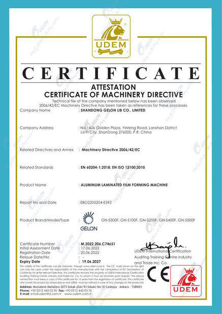 Standard:CE Number:EBO2205204-E592 Issue Date:2022-06-15 Expiry Date:2027-06-16 Scope/Range:ALUMINUM LAMINATED FILM FORMING MACHINE Issued By:UDEM |